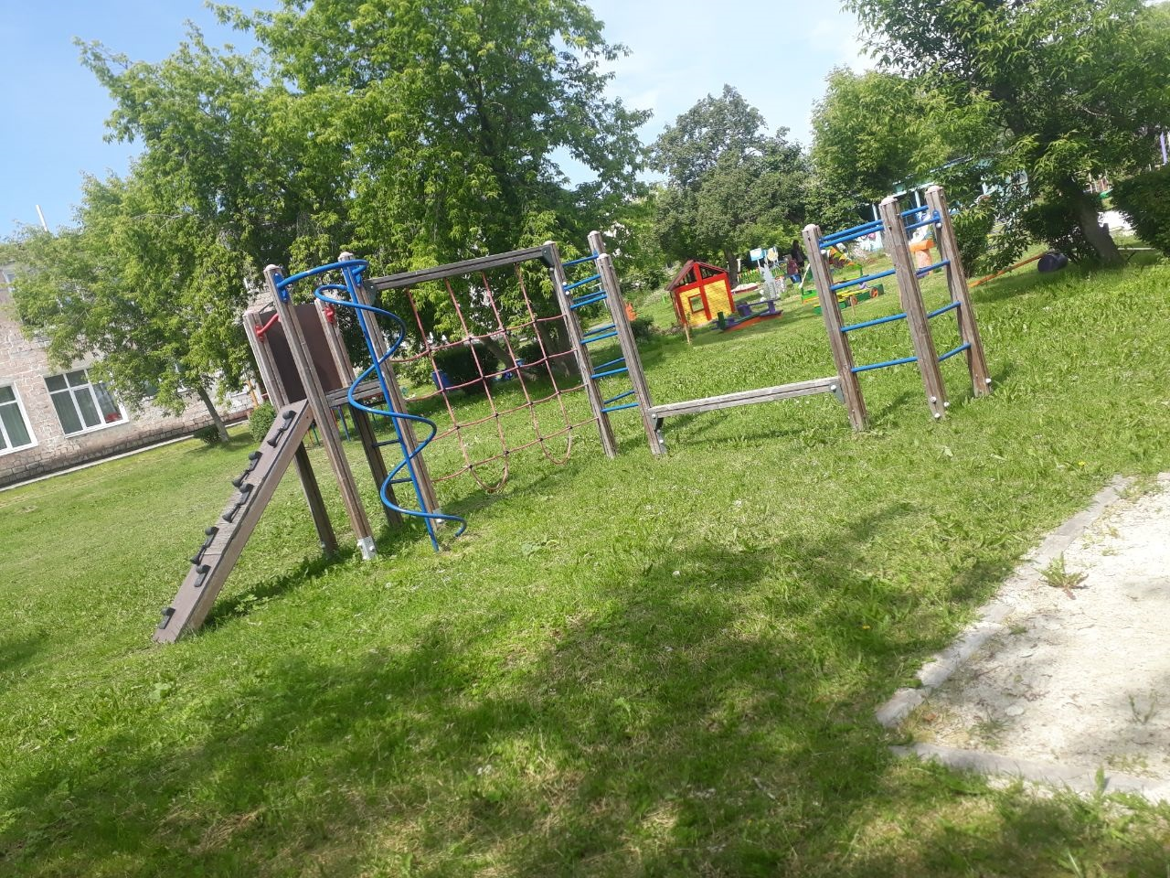 На территории ДОУ расположены: групповые участки 5 групп, учебный перекресток, огород, цветник, спортивная площадка.